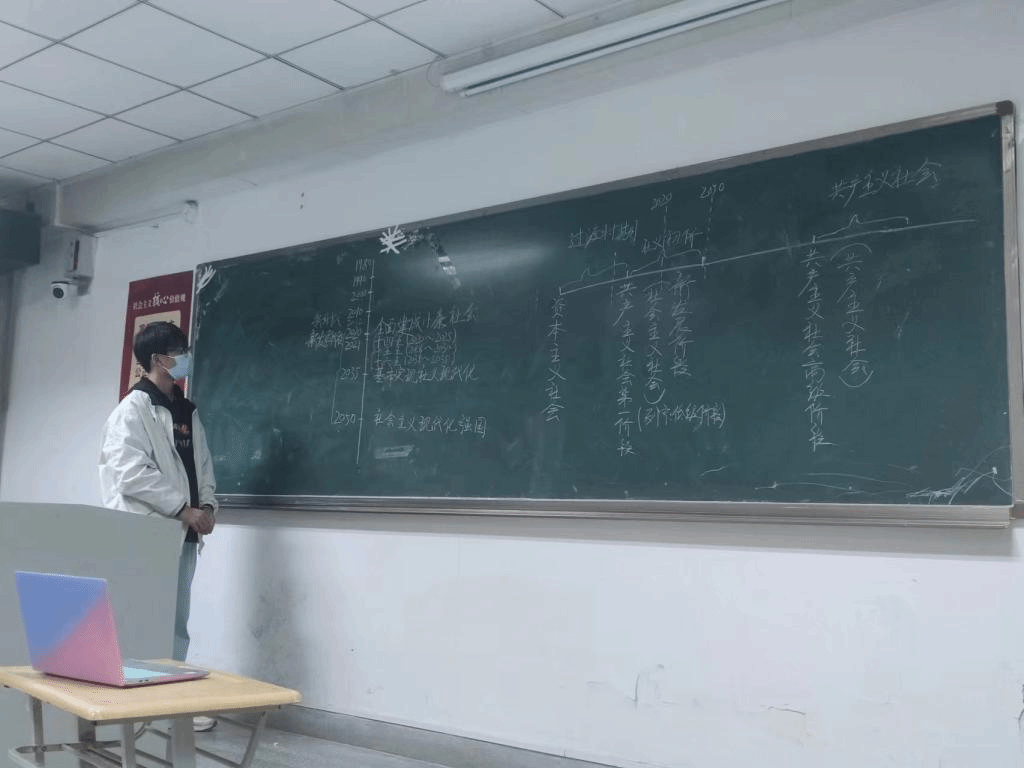 随后,孙教授提到,正确认识新发展阶段与社会主义初级阶段的关系,明确新发展阶段在社会主义初级阶段的历史方位,对于中国共产党实现第二个百年奋斗目标具有举足轻重的意义。在孙教授的线上指导下,司马永梁以板书的形式为同学们描绘了马克思、列宁关于共产主义的阶段划分,以及不同时期中国共产党关于社会主义初级阶段分几步走的战略蓝图。接着,孙教授结合中国实际,强调“新发展阶段”是社会主义初级阶段中的一个阶段。最后,孙教授就“共产主义第一阶段能否直接跳转到高级阶段”、“新发展阶段能否跨越社会主义初级阶段”等问题解释到,不同阶段的过渡和定位问题只能由实践来回答,这是由历史条件决定的,亦是一个动态的实践过程。