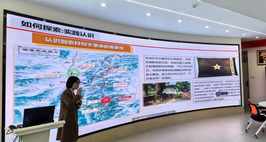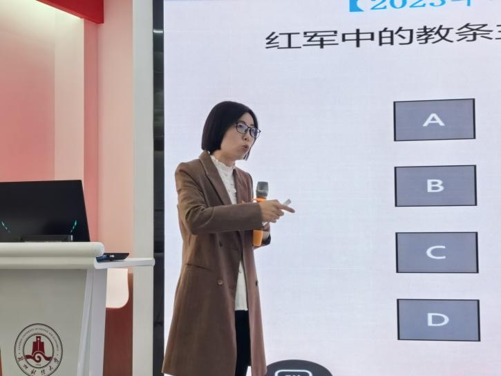 刘玉凤老师以《中国近现代史纲要》中的专题七中国革命新道路是怎样探索和开辟的,第五章中国革命的新道路为此次活动主要授课内容,采取的是学生在线听课互动,其他老师现场观摩学习的线上线下混合式教学模式。整堂课上,刘老师围绕着"何以探索,如何探索"展开讲述,通过创设真实的情境,引发学生的求知欲,让学生在思考中感受到解题的乐趣。同时,也针对如何组织课堂教学做出了相应的解读和展示,通过灵活多样的教学方式,把知识点串起来,使学生们能够形成完整、系统的知识框架